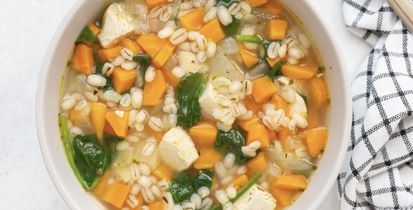 Ingredients like carrots, pearl barley, and baby spinach contribute to the dietary fiber content of this recipe. Dietary fiber aids digestion, helps maintain a healthy weight and lowers the risk of diabetes and heart disease.